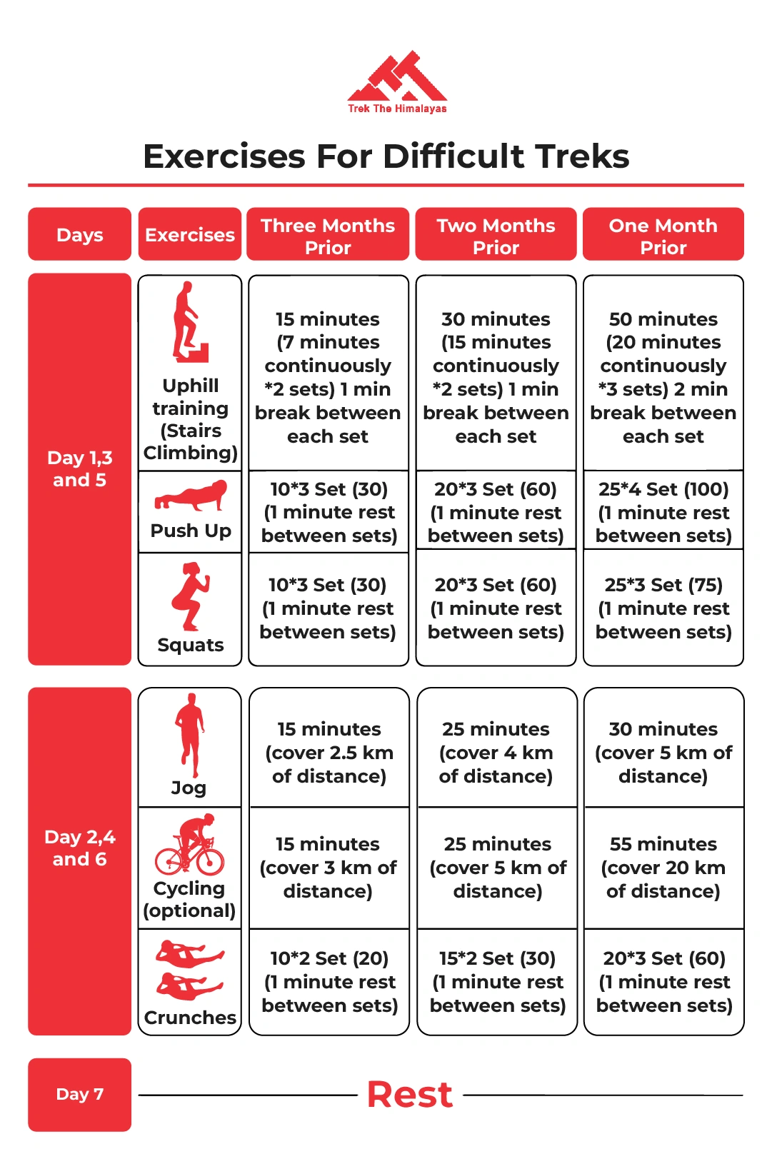 1. Cardiovascular endurance: Trekkers need to have good cardiovascular endurance to tackle challenging terrain and high altitude. Regular cardio exercises such as running, cycling, or swimming can help improve endurance.